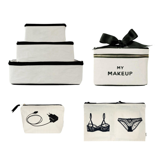 Paquete de 4 Travel Glam: organización, lencería, maquillaje y tecnología, negro