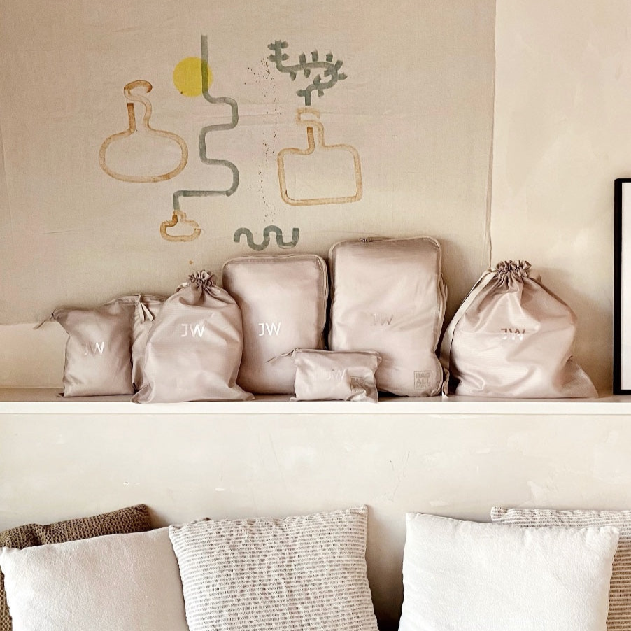 우리 고객들은 매우 창의적이며 다양한 모노그램을 만듭니다. 가장 일반적인 것은 자신의 이름, 별명, 이니셜 또는 성을 쓰는 것입니다. 때때로 우리 고객들은 가방에 무엇을 보관하고 있는지에 대한 설명을 씁니다. 예를 들어: 화장품, 양말, 세면도구 또는 의상. 그들은 또한 결혼 날짜와 같은 특정 날짜와 인용구를 씁니다. 오른쪽 사진에는 검은색 뷰티 박스 위에 세 글자의 이니셜이 있고, 같은 모노그램이 우리의 깅엄 포장 큐브에 있습니다. 귀엽죠?!
