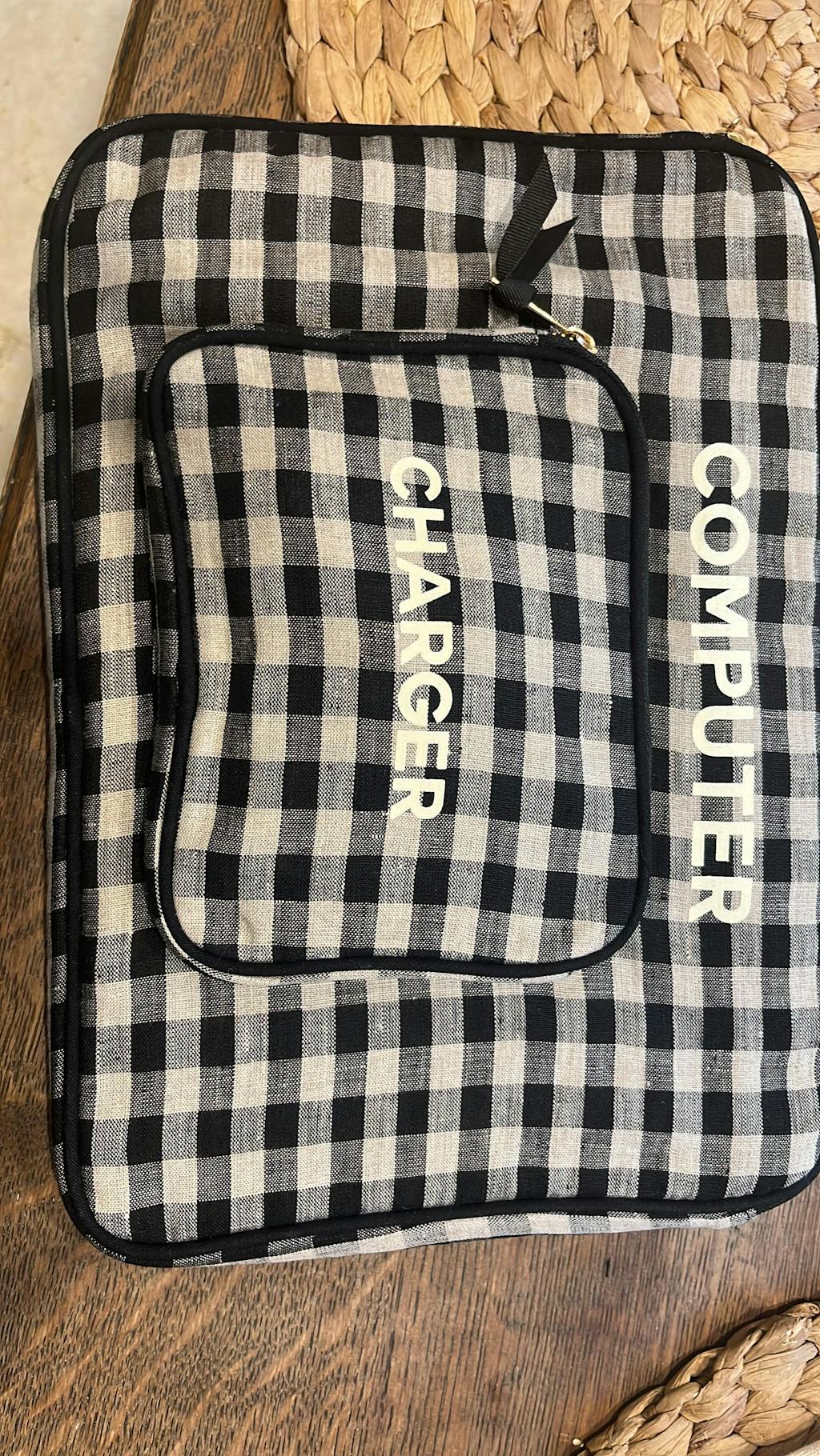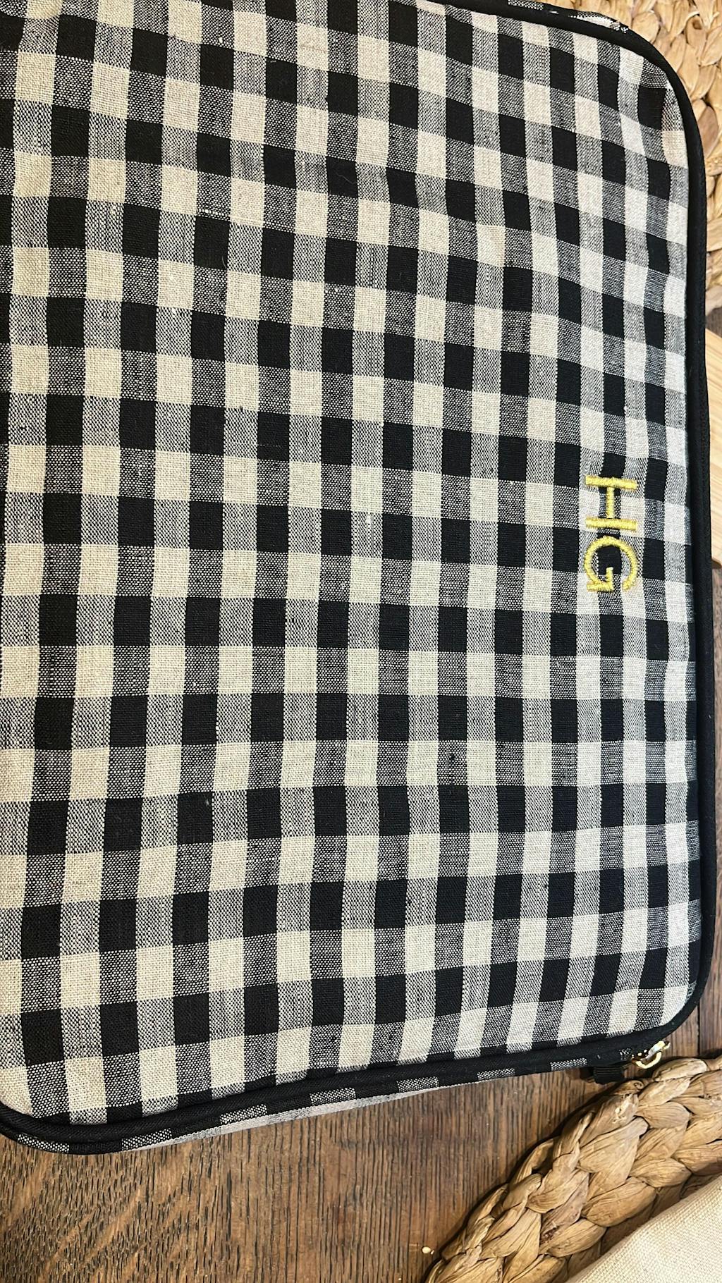 Protect and carry your laptop with ease using this 13" laptop case in pink. Designed with a padded lining for extra protection, it keeps your device safe from everyday bumps and scratches. The structured design features a top handle for easy carrying and a front charger pocket to store cables and essentials in one place. Crafted from durable natural cotton with Bag-all’s signature striped lining, it can be personalized with a monogram for a sleek and functional work or travel companion.