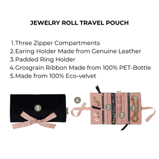 Effortlessly organize and protect your precious jewelry at home or while traveling with our eco-velvet Couture Jewelry Roll, Medium. With three zipper compartments, a genuine leather earring holder, and a padded ring holder, this stylish organizer keeps your accessories neatly organized and easily accessible. Personalize with a monogram for an extra special touch. Say goodbye to tangled necklaces and misplaced earrings - this is a must-have for every jewelry lover.