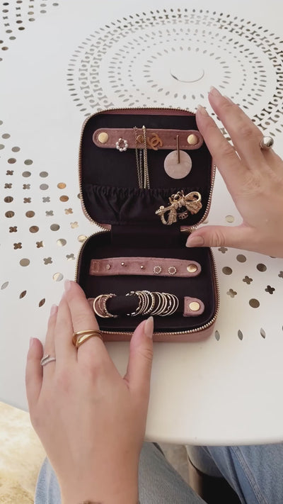 A compact jewelry box designed to store your everyday pieces neatly while traveling or at home. It can also be personalized with a monogram or embroidery. Features dedicated compartments for rings, earrings, and necklaces to keep everything organized and protected. Made from eco velvet crafted from recycled materials, offering a more sustainable choice while maintaining a soft, premium feel.