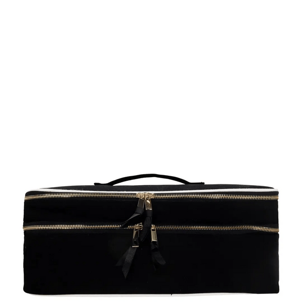 Introducing the Double Hair Tools Travel Case - which fits the parts of your Dyson Airwrap, and other hair tools! This high-quality case is designed to keep your hair tools organized and protected while you're on the go. The bottom compartment has a heat-protective lining, and the top compartment has rubber bands to keep the hair tool secure. There is also a pocket in the lid, which is perfect for keeping small things such as hair ties- and pins from disappearing. This case makes a perfect gift and can be customized with a monogram for that extra personal touch. Say goodbye to tangled cords and hello to hassle-free traveling with the Double Hair Tools Travel Case by bag-all.
