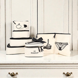 SAVE $26 and simplify your packing routine! The Travel Glam Set 4-Pack is a sleek, natural cotton organizer set designed for effortless order. This must-have collection includes Packing Cubes, a Double Lingerie Pouch, My Makeup Box, and a Charger Pouch.