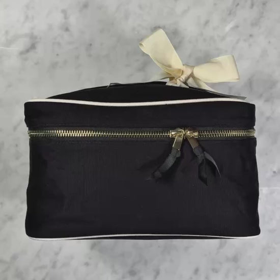 Made from 100% natural cotton, it features Bag-all’s signature striped, laminated lining that’s wipeable and mess-proof. The top handle adds convenience, while the recycled grosgrain ribbon bow adds charm. Want to make it extra special? Add a monogram and turn your beauty case into a personalized statement piece.