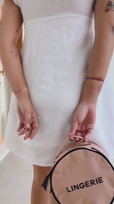 A round lingerie case designed to protect and organize delicate lingerie while traveling, with optional monogram personalization. The case is easy to store neatly inside a suitcase, while the secure zipper closure allows quick and easy access to contents. A practical handle makes it easy to carry, and Bag-all’s signature striped lining adds a recognizable design detail. Lightweight and practical, this lingerie case is ideal for travel and organized packing.